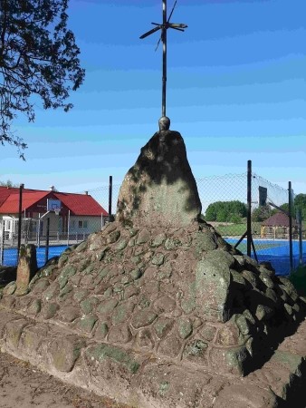 Denkmal für die Gefallenen des Ersten Weltkriegs: Stumpfe Pyramide aus Feldsteinen mit aufgesetztem Findling, an dem eine Widmungs- und Namenstafel und ein krönender Adler angebracht waren. Beides wurde entfernt und ein christliches Kreuz aufgesetzt.