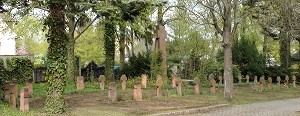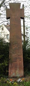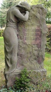 Der Gedenkstein für die Opfer des Zweiten Weltkrieges ist eine Nachnutzung. Ursprünglich wurde er als Grabstein für die Tochter eines Reitschulenbesitzers verwendet (Mainzer Sandstein mit figürlicher Darstellung eines trauernden Mädchens). Die dahinterstehenden 26 Holzkreuze sind in guter Verfassung. Sie beschreiben unter anderem einen unbekannten Soldaten und einen unbekannten Feuerwehrhelfer (ca. 17 Jahre alt).