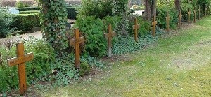 Das Denkmal für den Ersten Weltkrieg befindet sich am Eingang des Friedhofs und einige Einzelsteinkreuze sind schwer lesbar aufgrund von Abnutzung durch Witterungsbedingungen.