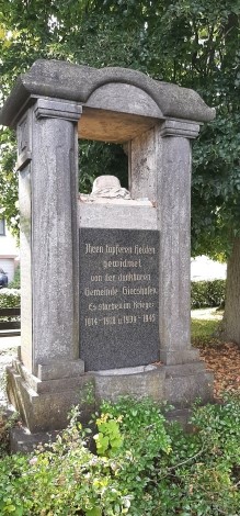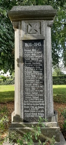 Denkmal der Ortsgemeinde auf einem kleinen Ehrenplatz in der Dorfmitte. Sehr schöne Steinsäule, vierseitig angelegt. Oben ein deutscher Stahlhelm auf Eichenlaubkranz. Die Frontseite zeigt die Widmung.