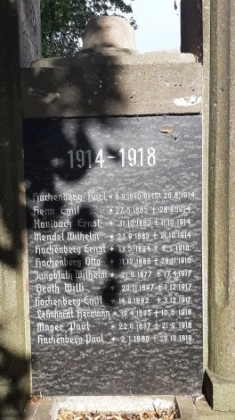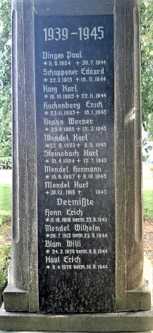Auf der Rückseite die Namen der Gefallenen und Vermissten des Ersten Weltkriegs auf einer schwarzen Marmortafel in silberner Schrift eingraviert. Die Opfer des Zweiten Weltkrieges wurden auf den beiden Seitenflächen in gleicher Weise erfasst.
