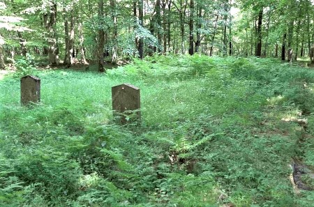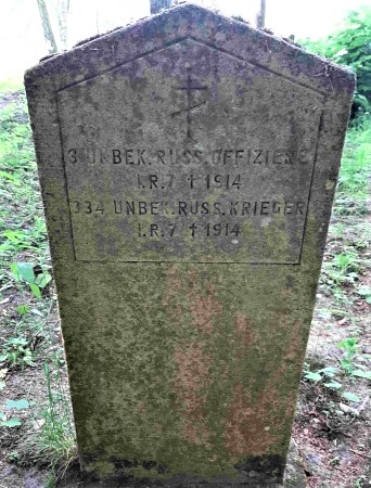 Kriegsgräberstätte für Gefallene des Ersten Weltkriegs westlich des Ortes im Wald: Rechteckige Fläche mit großen Grabsteinen auf Massengräbern. Hier ruhen 79 deutsche Soldaten (davon 29 unbekannt) und 337 unbekannte russische Soldaten.