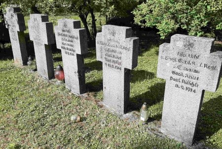 Die Namen und Daten der deutschen Soldaten sind auf den Grabsteinen teils schon verwittert oder schlecht nachgemalt worden. Die noch lesbaren Namen wurden ergänzt aus dem Buch von M. Dehnen: "Die Kriegsgräber in Ostpreussen von 1914/15“.