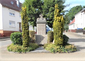 Denkmal von Bäumen und Sträucher umgeben an einer Straßengablung. Am Denkmal sind die Namen der Gefallenen des Ersten Weltkriegs, unten eine Steinplatte mit Inschrift, rechts und links daneben eine Steinplatte mit den Namen des Zweiten Weltkriegs.