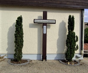 Auf dem Friedhof ein Holzkreuz mit einer Inschrift.