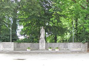An einer halbrunden Mauer sind sechs Gedenkplatten eingelassen. Vor der Mauer steht eine quadratische Steinsäule auf der eine Soldatenfigur steht.