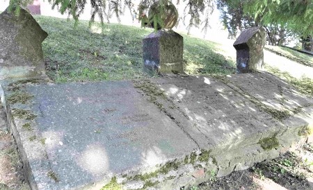 Denkmal für die Gefallenen des Ersten Weltkriegs vor der Kirche: Abgestufter Obelisk mit unten eingelassenen Steintafeln. Das Denkmal wurde abgerissen und drei der Steintafeln abgelegt am Kirchenhügel.