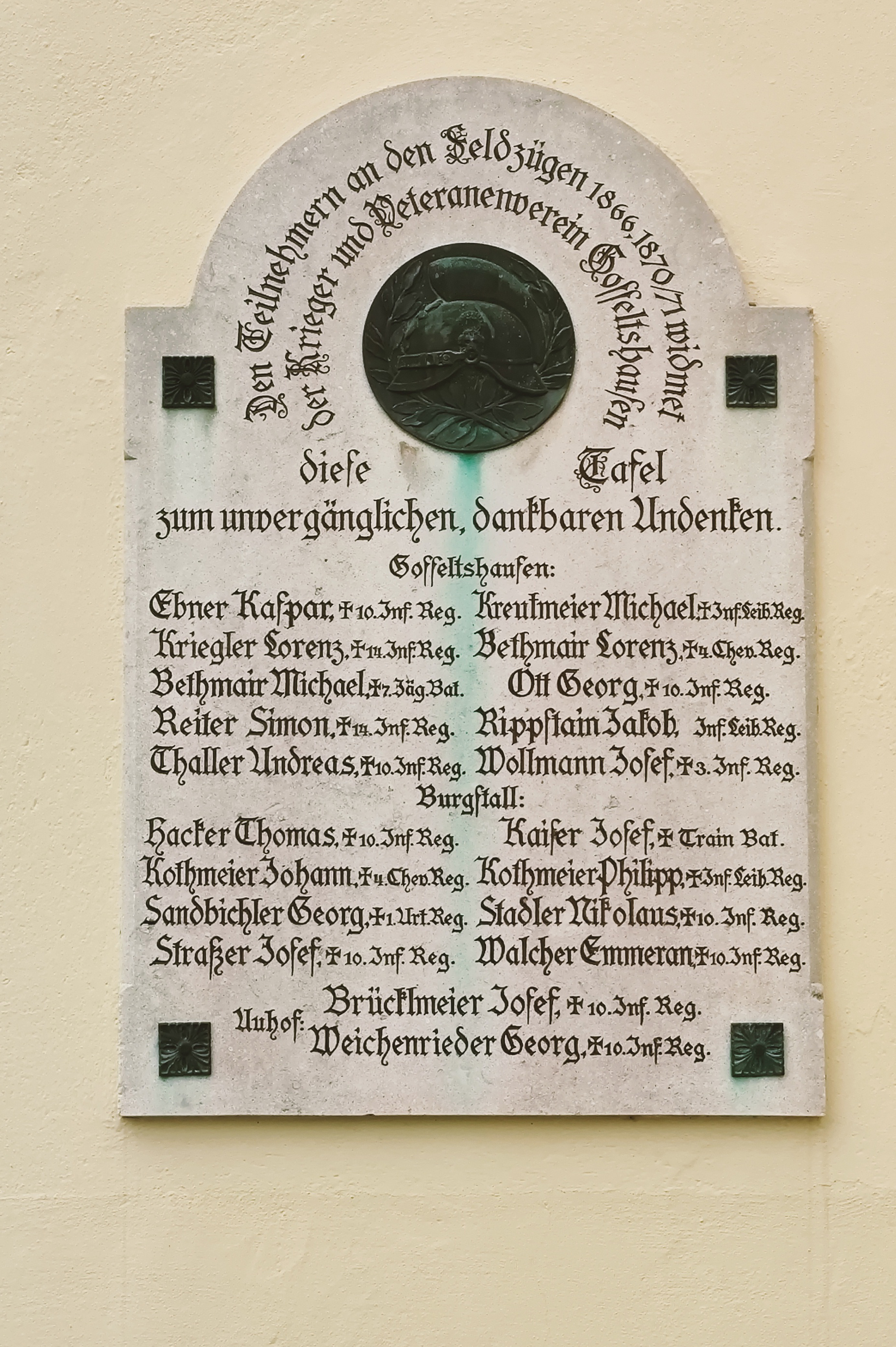 Gedenktafel für die Feldzugsteilnehmer von 1866 und 1870/71 an der Kirche auf dem Friedhof,