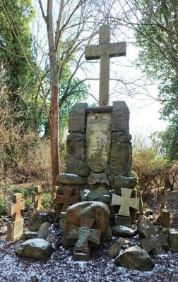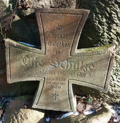 Stele aus Feldsteinen mit Kreuz obenauf, mehrere einzelne Steine in Form eines Eisernen Kreuzes.