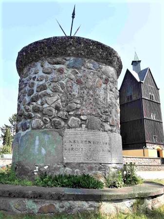 Denkmal für die Gefallenen des Ersten Weltkriegs auf dem Platz vor der Kirche: Runder Feldsteinturm mit unten umlaufenden Inschriften (teils zerstört und verwittert). Das Denkmal wird gekrönt von einer Kugel und Metall-Speeren, die daraus hervorragen. In die Wand ist über der Widmung ein erhabenes EK-Zeichen mit kleineren Steinen eingelassen worden.
