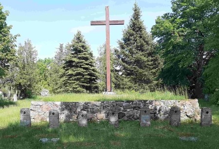 Umlaufend sind stehende und liegende Grabsteine aufgestellt worden. Viele davon sind nicht mehr lesbar. Es sind 218 deutsche und 112 unbekannte russische Soldaten hier bestattet.