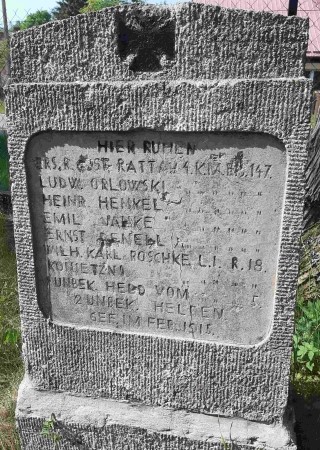 Nach 1945 wurde in Ostpreußen die deutsche Bevölkerung vertrieben und die meisten Denkmäler abgerissen, beschädigt oder umgewidmet. Diese Kriegsgräberstätte ist in ihrer Form erhalten, aber vor allem die liegenden Grabsteine sind nicht mehr ablesbar. Fehlende Namen konnten aus dem Buch gewonnen werden von M. Dehnen: „Die Kriegsgräber in Ostpreussen von 1914/15". Die Erhöhung in der Mitte war der Sockel des ehemaligen Kaiserstein Denkmals, das am 17.10.1915 eingeweiht wurde. Dieses wurde nach 1945 bis auf den Sockel abgerissen und die Tafeln vernichtet.
