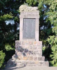Oben ein schlafender Löwe, darunter eine Metalltafel mit Namen beider Weltkriege mit Todesdatum.