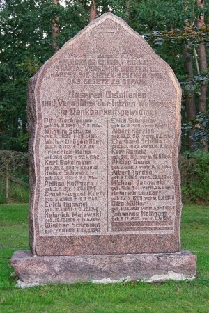 Gedenkstein mit eingravierten Namen der Gefallenen des Ersten und Zweiten Weltkriegs des Ortes Grebshorn auf dem kleinen Friedhof des Ortes (im Süden gelegen, Kapellenweg).