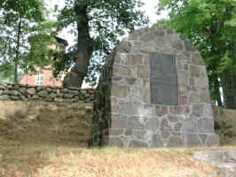Ein Steindenkmal am Berghang vor der Kirche. Bronzetafel mit den Namen der Gefallenen des Ersten Weltkriegs.