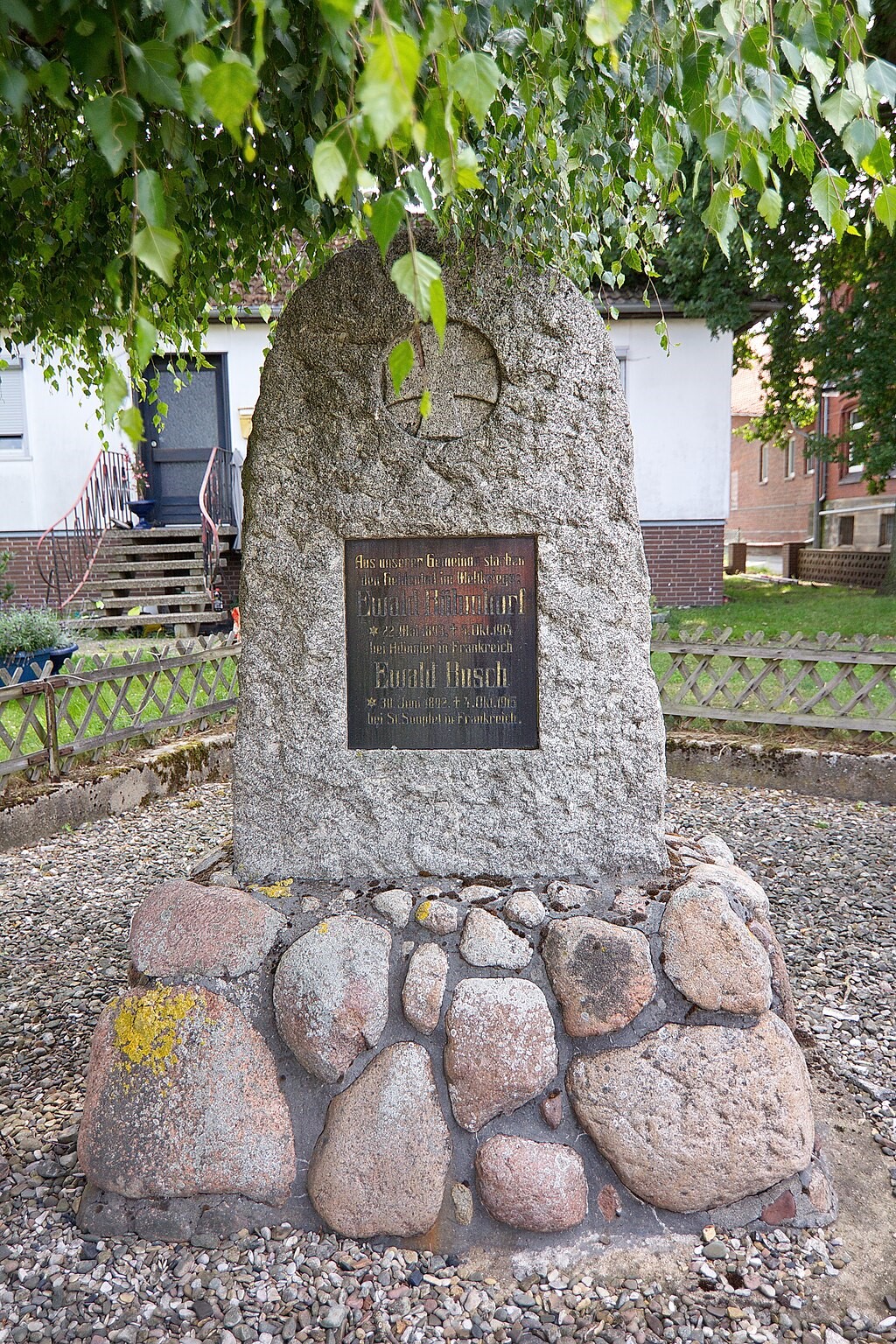 Ehrenmal für zwei Gefallene des Ersten Weltkriegs: Findling auf Natursteinsockel.
