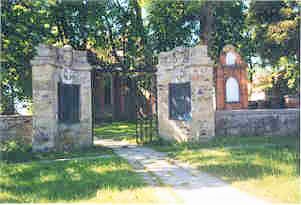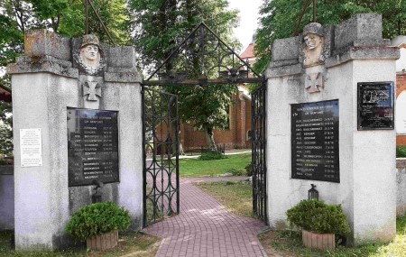 Erster Weltkrieg: Zwei Steinplatten eingelassen rechts und links vom Eingang zum Kirchhof in Groß Bertung mit den Namen der Gefallenen. Darüber EK-Zeichen und jeweils ein Soldatenkopf mit Stahlhelm. Eine Erklärungstafel in Polnisch wurde seitlich befestigt.