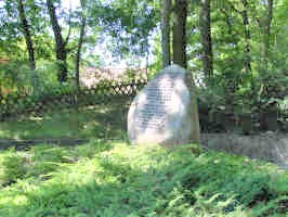 Ein Findling mit Namen in Metallbuchstaben in einer kleinen, von einer Feldsteinmauer umgebenen Anlage an der Straße Richtung Jastorf.