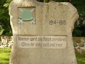 Gedenkstein Erster Weltkrieg neben der Kirche mit dem Relief eines Stahlhelms über gekreuzten Schwertern, ferner eine Inschrift.
