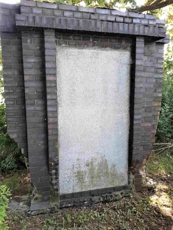Denkmal für die Gefallenen des Ersten Weltkriegs: Aus Ziegelsteinen gemauerte abgestufte Wand mit eingelassener Widmungs- und Namensfläche am südlichen Ortsrand.