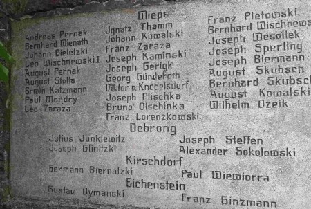 Nach 1945 wurde in Ostpreußen die deutsche Bevölkerung vertrieben und die meisten Denkmäler abgerissen, beschädigt oder umgewidmet. Hier wurden die Tafeln abmontiert und erst 2007 wieder angebracht. Die rechte Tafel scheint neu angefertigt worden zu sein. Dabei scheinen zwei Vornamen nicht mehr bekannt gewesen zu sein, bei diesen wurde „Herr“ eingetragen.