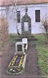 Denkmal und Gräber vor der Kirche. Aus dem Denkmal für die Gefallenen des Ersten Weltkrieges wurde offensichtlich die Tafel entfernt.