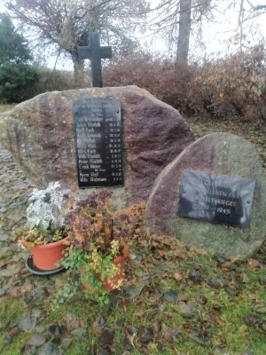 Kriegerdenkmal Erster Weltkrieg, dazu zwei Gedenkplatten Zweiter Weltkrieg auf dem Friedhof im Pösel.
