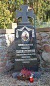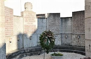 In der Mitte eine größere Stele mit Steinkreuz und Beschriftung.