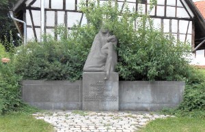 Trauergruppe auf Sockel mit Inschrift vor der Großengstinger Kirche. Rechts (Zweiter Weltkrieg) und links (Erster Weltkrieg) Tafeln mit den Namen der Toten beider Weltkriege.