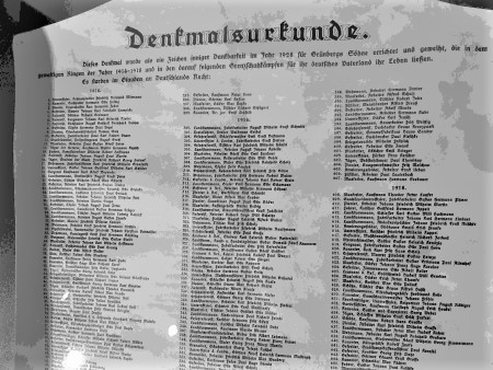 Dieses Denkmal wurde als ein Zeichen inniger Dankbarkeit im Jahre 1928 für Grünbergs Söhne errichtet und geweiht, die in dem gewaltigen Ringen der Jahre 1914-1918 und den darauf folgenden Grenzschutzkämpfen für ihr deutsches Vaterland ihr Leben ließen.