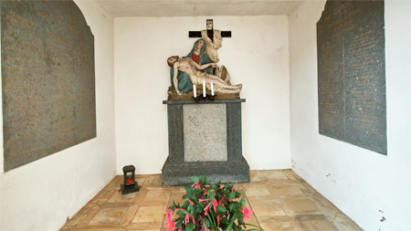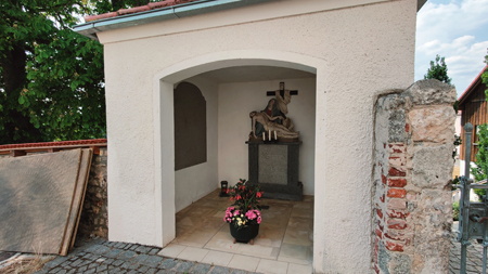 Gedenkhäuschen gegenüber dem Kircheneingang an der Mauer.