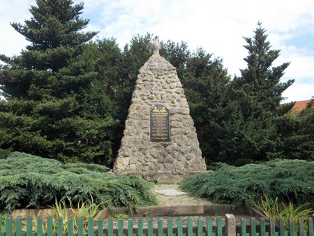 Aus Feldsteinen gemauerte Pyramide mit eingesetzter Namenstafel aus Marmor. Auf der Spitze ein Adler.