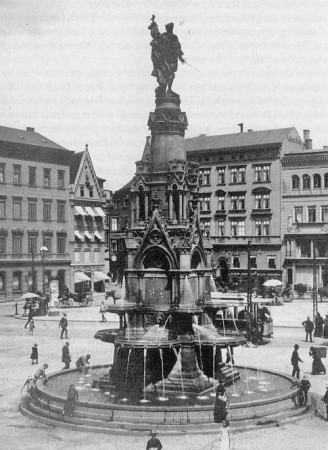 Das auch „Siegesbrunnen“ genannte Denkmal wurde vom Baumeister Stier aus Hannover entworfen und vom Baumeister Keferstein aus Halle erschaffen. Als krönende Bronzefigur sollte zuerst eine Germania dienen, doch dann entschloss man sich für die außergewöhnliche Figur eines Landsknechts im Stile Ulrich von Huttens, die vom Bildhauer Schaper hergestellt wurde. Das Denkmal wurde am 22.09.1878 eingeweiht. Auf den Tafeln waren die Namen von 72 Gefallenen aus Halle notiert. Es wurde 1926 demontiert um Platz für den Bau einer Straßenbahnlinie zu schaffen. Das Bassin wurde auf dem Triangel am Steintor wiedererrichtet und besteht noch heute. Was mit den Teilen des Denkmals geschah war nicht herauszufinden, es scheint auch nichts eingelagert worden zu sein.