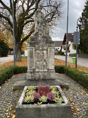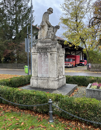 Auf dem Denkmal in der Ortsmitte steht ein lebensgroßer Soldat, der seinen gefallenen Kameraden hält.