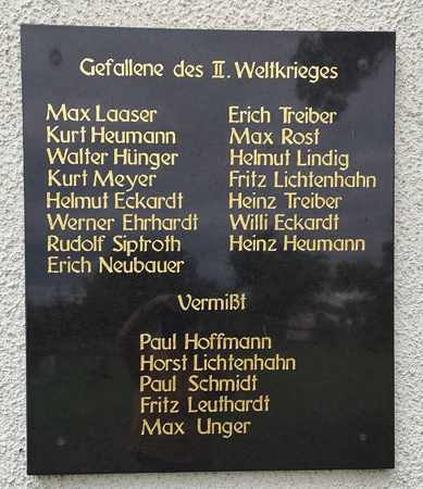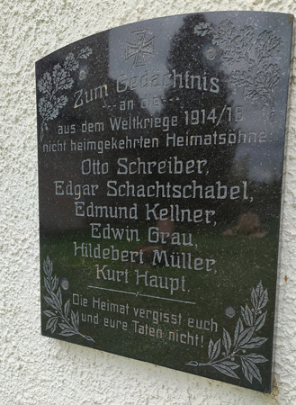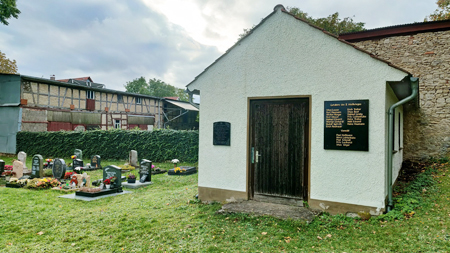 Gedenktafeln für beide Weltkriege an der Aussegnungshalle auf dem Friedhof bei der Kirche.