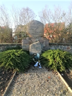 Naturstein gemauerter Sockel mit einem Findling, davor ein Gedenkstein an der Hauptstraße.