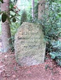 Findling mit Inschrift und Gedenksteine auf dem Friedhof.
