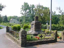 Oben ein Findling mit Lorbeerkranz und Kreuz (Krone + W), sowie Inschrift. In alle vier Seiten sind Tafeln mit den Namen der Gefallenen aus dem Ersten Weltkrieg eingelassen.