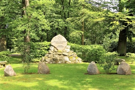Auf vier davorstehenden Feldsteinen sind die Namen der Gefallenen des Ersten und Zweiten Weltkriegs eingraviert. Das von einer Hecke umrahmte Gelände ist sehr gepflegt.