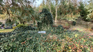 Der Naturstein auf dem Friedhof für den 1. Weltkrieg ist vollständig zu gewachsen, trug aber augenscheinlich nie Namen.