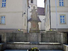 Auf dem Kirchplatz befindet sich das Kriegerdenkmal ("Marienbrunnen"): auf einer Säule, die als Brunnen dient, eine Marienstatue.