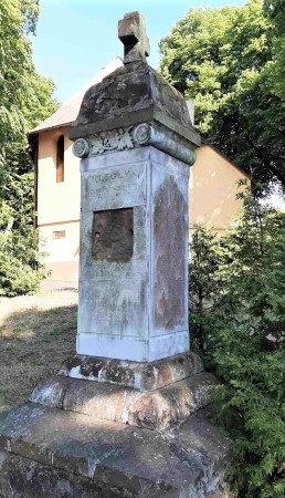 Reste eines Denkmals für die Gefallenen des Ersten Weltkriegs vor der Kirche: Abgestufte und verzierte Stele mit krönendem Kreuz. Alle Inschriften wurden beseitigt.