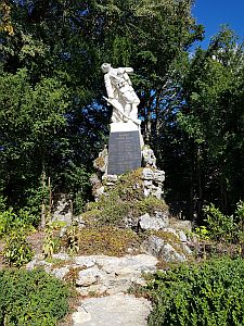 Darauf eine Soldatenfigur, tödlich getroffen. Darunter ist eine Gedenkplatte angebracht.