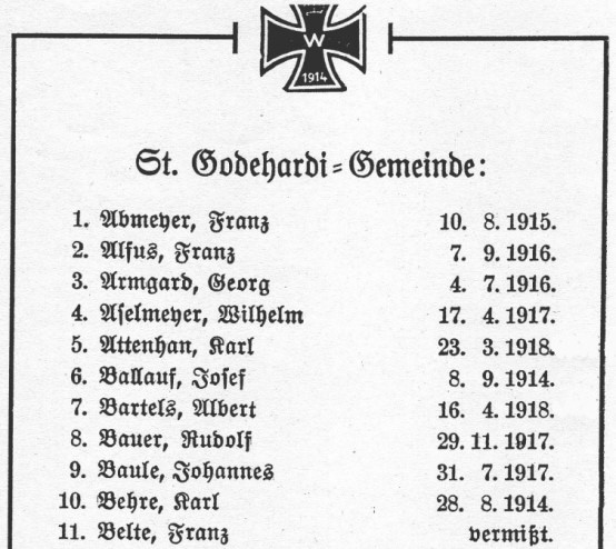 Grüne Schrift = Ergänzung aus den Verlustlisten (genealogy.net), Denkmalprojekt, Denkmal St. Godehardi, Denkmal Bettmar, Denkmal Nordstemmen, Denkmal Bavenstedt, Begräbnisbuch St. Godehardi, Max Dehnen-Kriegsgräber in Ostpreußen 14/15 Regimentsgeschichten mit Ehrentafeln: Garde Pionier Bataillon, Lehr Infanterie Regiment, 1. Garde-Regiment z.F., 2. Garde-Regiment z.F., Landwehr Infanterie Regiment Nr. 6, Jäger Bataillon Nr. 10, Reserve Jäger Bataillon Nr. 22, Infanterie Regiment Nr. 23, Füsilier Regiment Nr. 73, Reserve Infanterie Regiment Nr. 73, Infanterie Regiment Nr. 74, Infanterie Regiment Nr. 77, Reserve Infanterie Regiment Nr. 77, Reserve Infanterie Regiment Nr. 78, Infanterie Regiment Nr. 79, Reserve Infanterie Regiment Nr. 91, Infanterie Regiment Nr. 92, Reserve Infanterie Regiment Nr. 92, Infanterie Regiment Nr. 128, Infanterie Regiment Nr. 145, Infanterie Regiment Nr. 150, Reserve Infanterie Regiment Nr. 215, Reserve Infanterie Regiment Nr. 229, Reserve Infanterie Regiment Nr. 230, Reserve Infanterie Regiment Nr. 232, Infanterie Regiment Nr. 465.