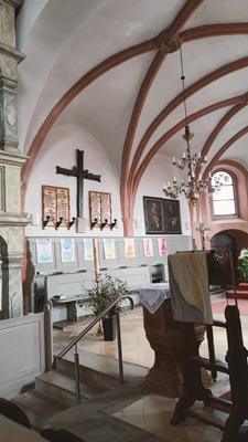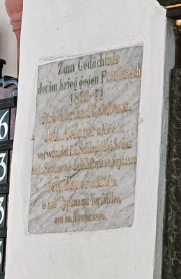 Im abgesperrten Altarraum hängt eine Steintafel für den Feldzug 1870/71, gegenüber zwei Holztafeln für den 2. Weltkrieg.