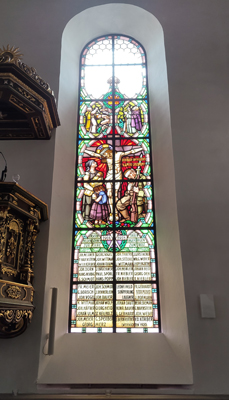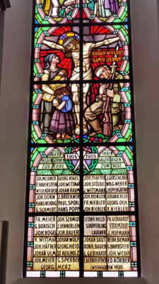 Auf dem kunstvoll gestalteten Kirchenfenster neben der Kanzel stehen die Namen des 1. Weltkriegs.