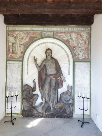 Im Eingangsbereich der katholische Kuratiekirche Mariä Himmelfahrt eine Nische mit einem auf Steinplatten stehenden Christus, der seine Wunden zeigt.