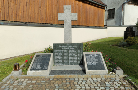 Das Kriegerdenkmal auf dem Kirchfriedhof wird markiert von einem christlichen Kreuz.