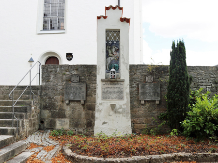 Am Aufgang zur Kirche steht eine verputzte Steinsäule mit einer Nische in der sich ein Bildnis des Hl. Georgs befindet.