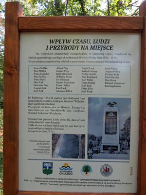 Eine Infotafel zeigt eine Beschreibung des Denkmals und führt die Namen der Gefallenen auf. Die Schreibweise weicht zum Teil von der Originaltafel ab.